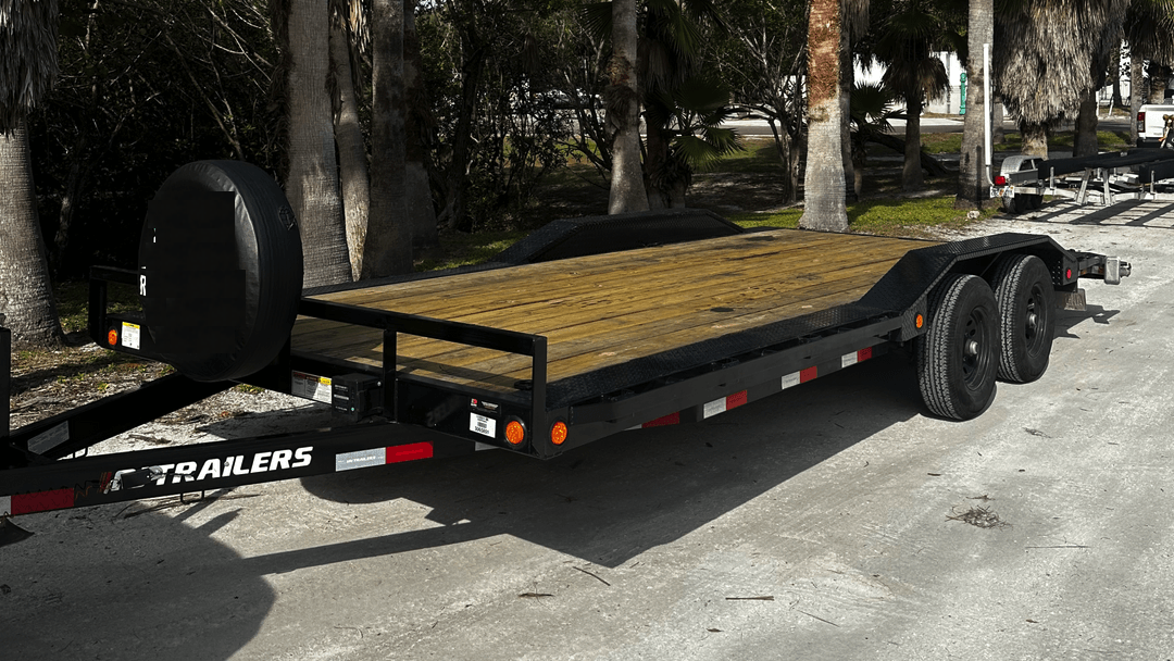 The PJ Trailers 8.5x20ft Superwide Car Equipment Hauler is designed for transporting vehicles and heavy equipment with ease. It features a spacious 8.5-foot width and a 20-foot length, providing ample room for larger loads. The trailer is built with a durable steel frame and includes a treated wood deck for enhanced stability and longevity. It typically comes equipped with adjustable ramps for easy loading and unloading, along with sturdy tie-down points to secure your cargo. Ideal for both professional and personal use, this trailer combines functionality with robust construction. Rear slide-in ramps and D-rings, rachet pockets all along trailer. Drive-over fenders, extra wide (8.5 feet) Great fit for any bigger/wider loads (trucks/Jeeps etc.)