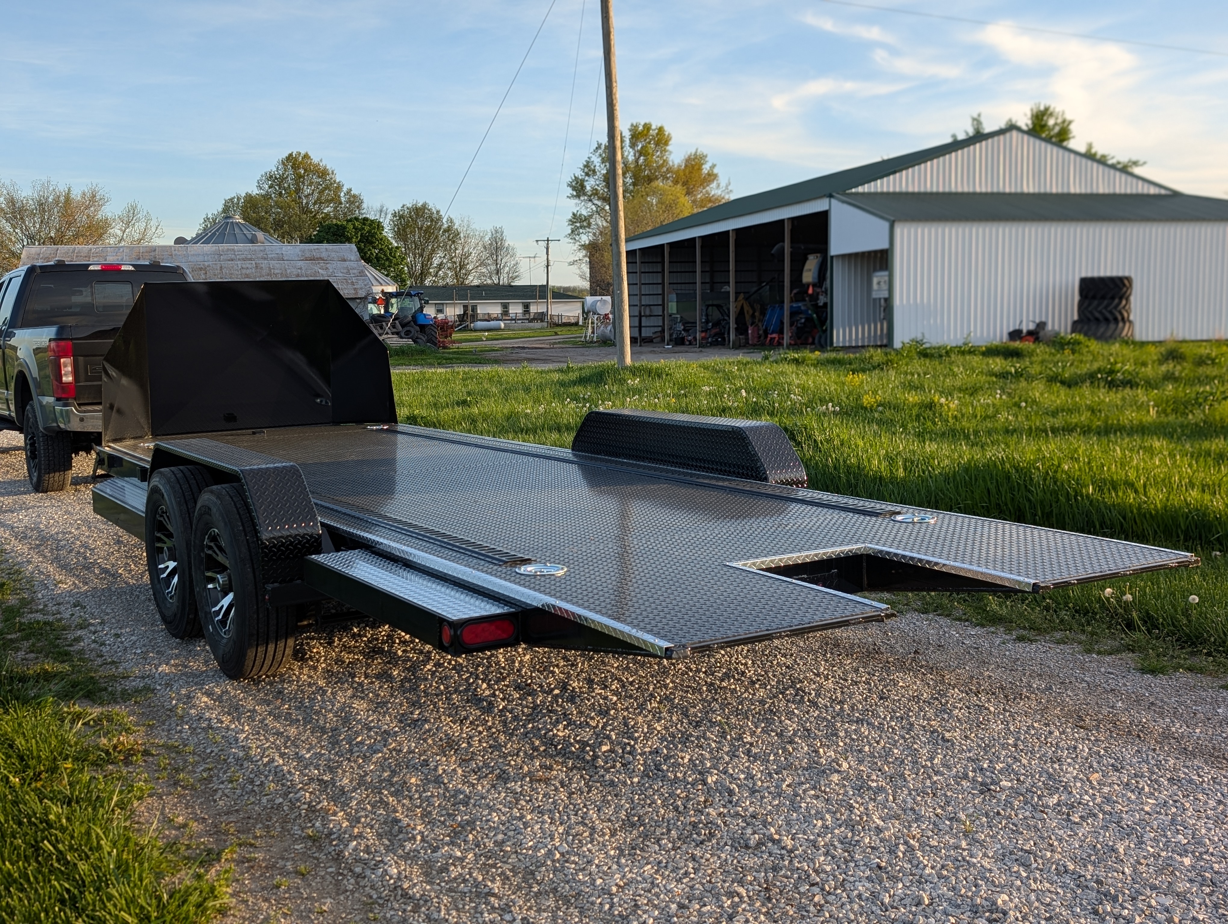 The Terminator is a 22' x 83" split tail Full tilt car hauler with 7k axles 12k lbs winch Inlayed etrac D rings and rock guard.