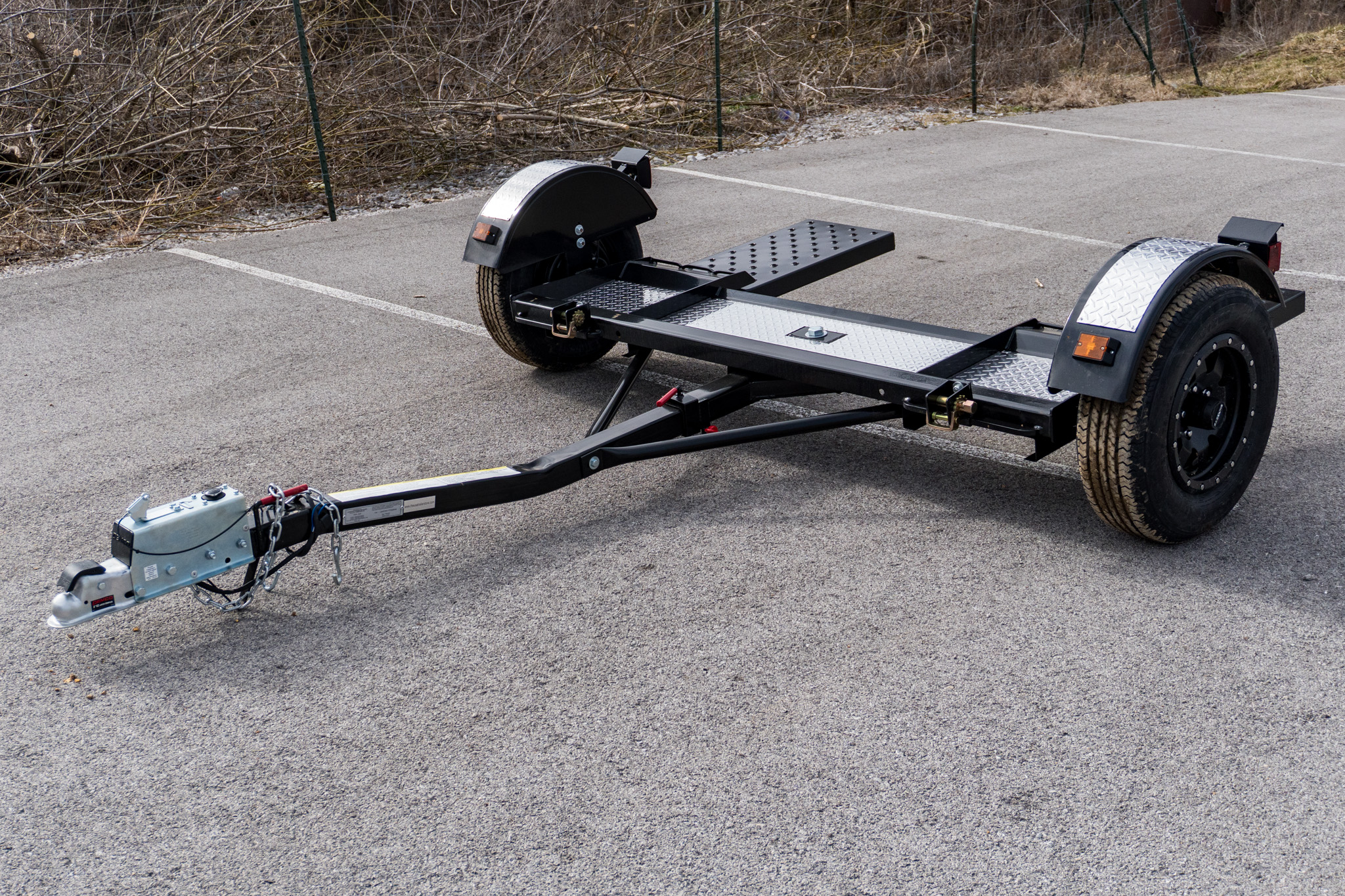 Heavy-duty car tow dolly for towing small, medium, or large cars, trucks, and vans. Features built-in surge brakes so no trailer brake system is needed. Easy on and off setup with brake light hookup included. Includes tire straps for secure wheel mounting.
