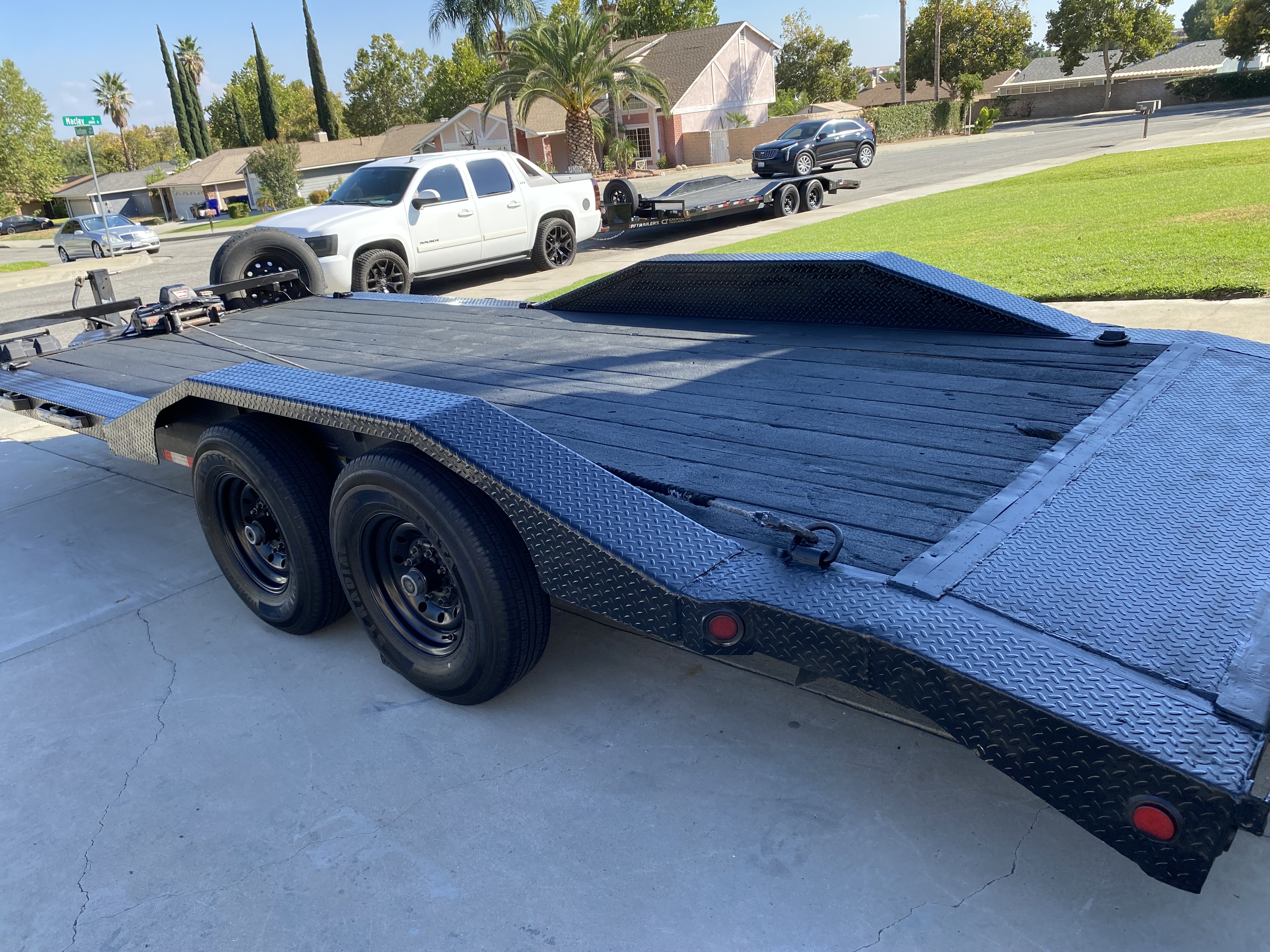 20ft long by 8.5 feet wide with drive over fenders. Equipped with 10k winch and wireless control. Comes with straps, hitch and ball, j hooks, ramps and spare tire.