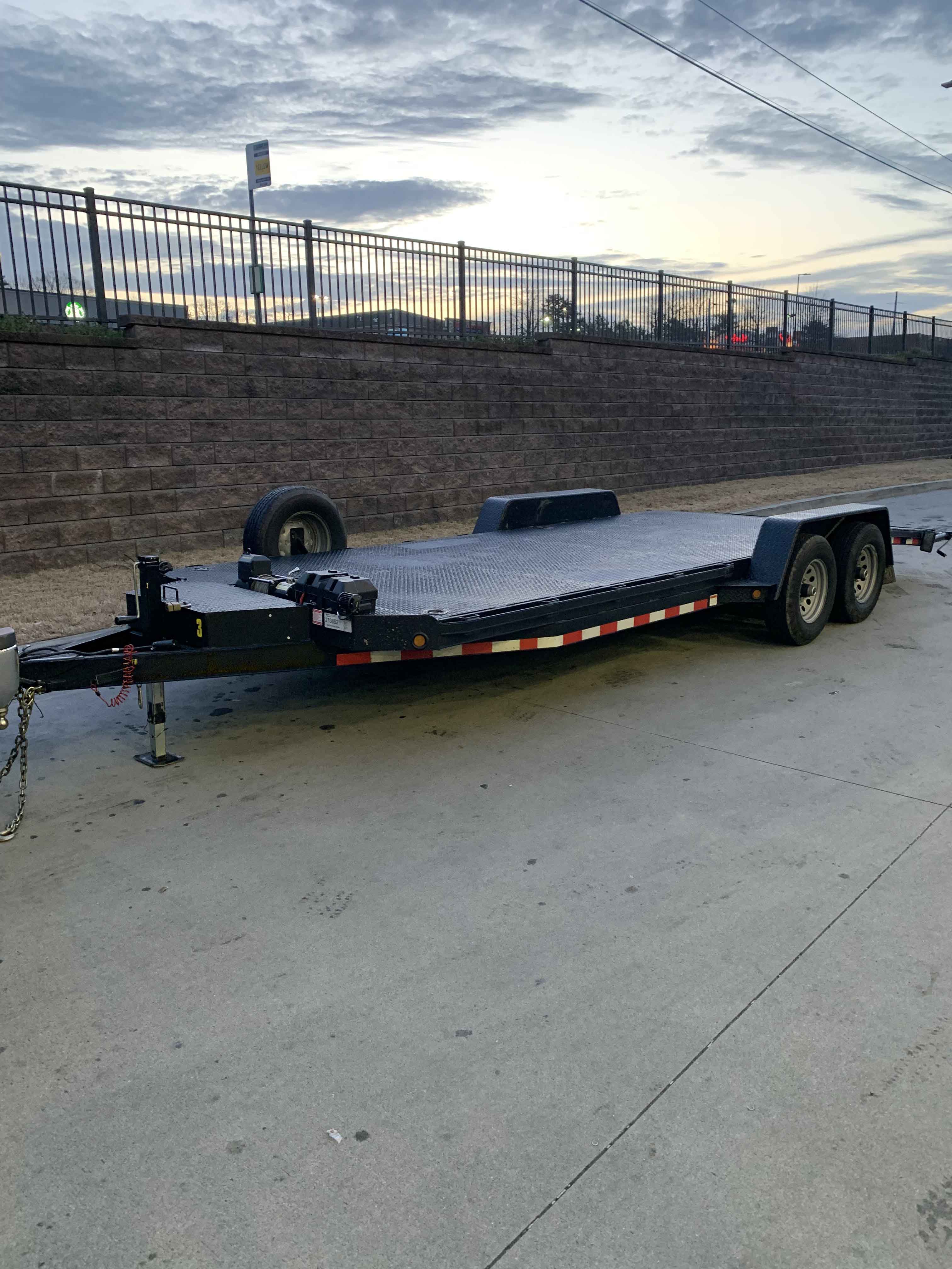 Our 2024 21' Kaufman Deluxe Car Trailer (Open Trailer) is designed to safely transport cars, trucks, and other vehicles. With a length of 21 feet and a width of 7 feet, this trailer can handle most vehicles. No mileage limit. It comes with features like winch, spare tire, stabilizer jacks, toolbox, and battery. We also provide items like recovery strap, three different type of car tie downs, cargo straps, bridle straps and a ball mount to make your transportation process more convenient. Just let us know what you need, we may have it. All at no extra charge.