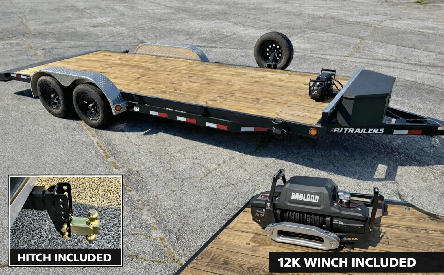 20’ PJ Car Hauler trailer rental (7k GVWR) - 12k winch, hitch, and straps included Need a reliable trailer for hauling vehicles? This 20’ PJ car hauler is built tough and ready to work Features: • 20 fr deck - perfect for cars, smaller trucks and equipment - 18’ flat, 2’ dovetail • 7,000 lb GVWR, 5,000 lb capacity • 12,000 on winch INCLUDED - makes loading inoperable vehicles easy • Adjustable tow hitch INCLUDED - ready to hook up • Heavy duty tie down straps INCLUDED • Wood deck in great condition • Tandem axles for smooth stable towing • Movable D-rings for secure tie down points Perfect for: • Car hauling/Transport • smaller trucks and equipment • SXS, UTV, ATV Clean, dependable, and ready to go! Hook up and hitch the road today!