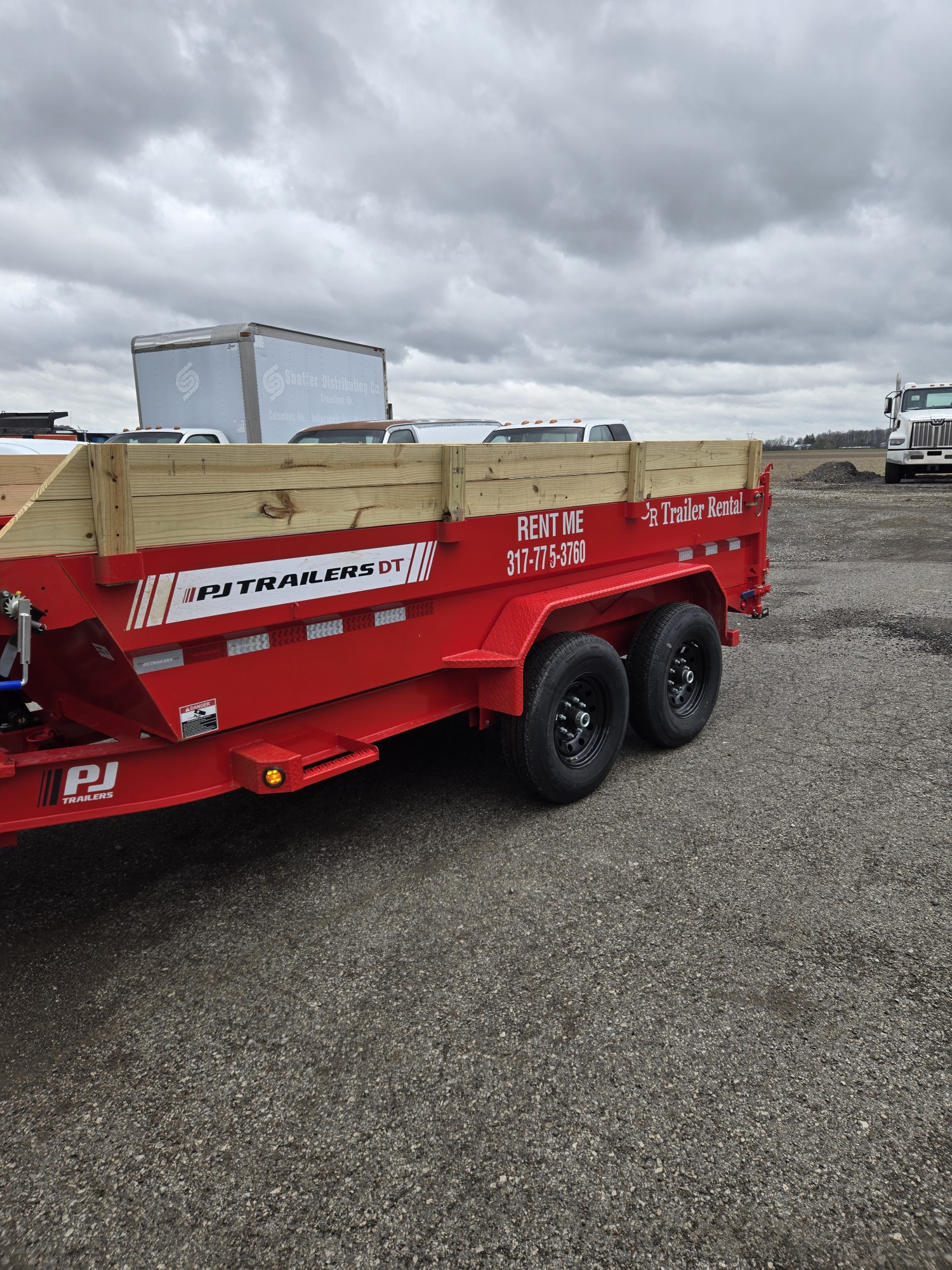 2026 PJ DT1 dump trailer with telescopic dump. 14ft X 83in Commercial grade Barn/tailgate spreader. Extended side walls slide out ramps and stabilizer jacks. Tarp system 11,000lbs load capacity. 4- d rings inside *BRAKE CONTROLLER REQUIRED*