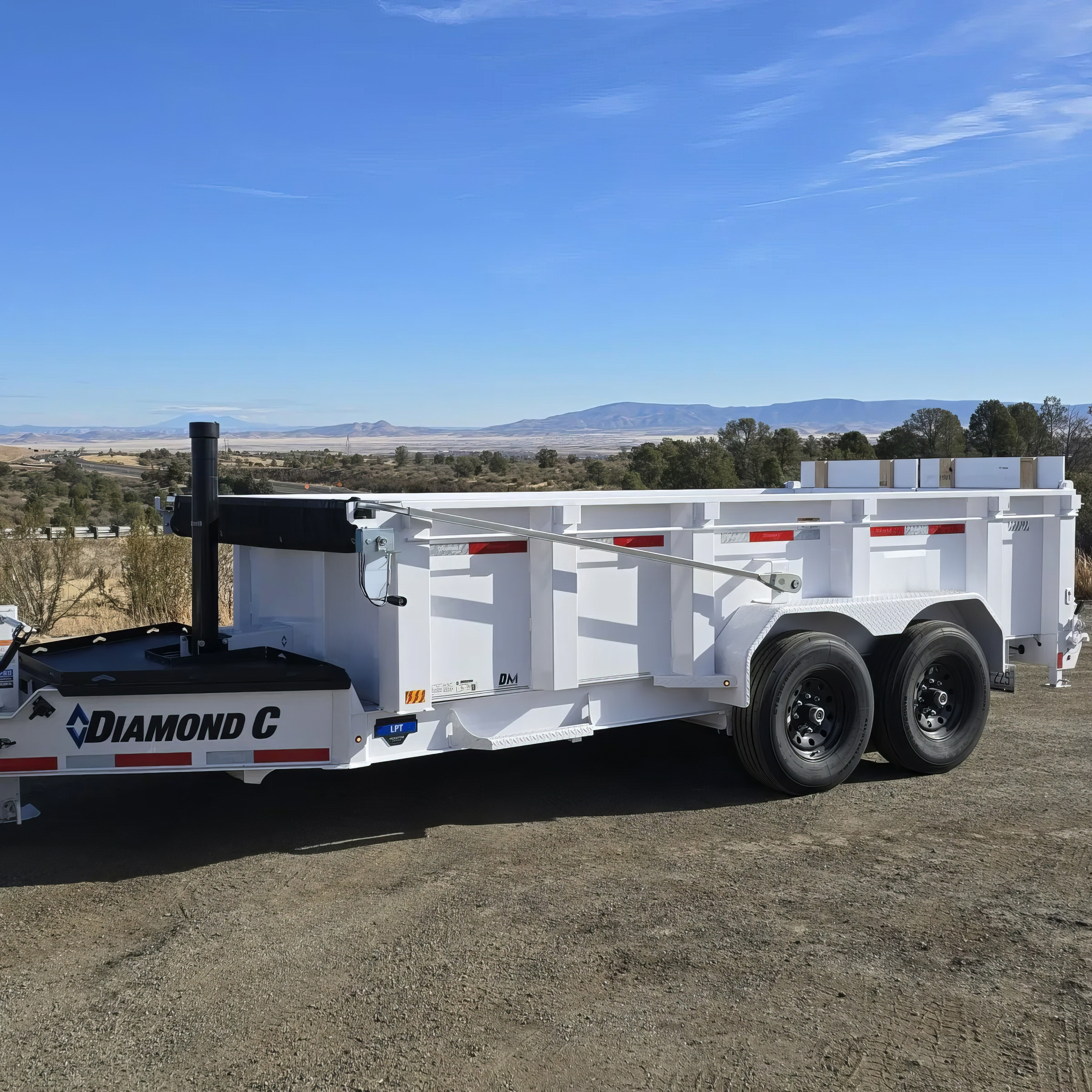Dusty is a powerhouse Diamond C dump trailer with a 14,000 lb GVWR. Featuring hydraulic lift capability, it makes quick work of hauling and dumping dirt, rock, brush, or construction debris. Built tough for heavy use, Dusty is the go-to trailer for serious clean-up and material-moving jobs.