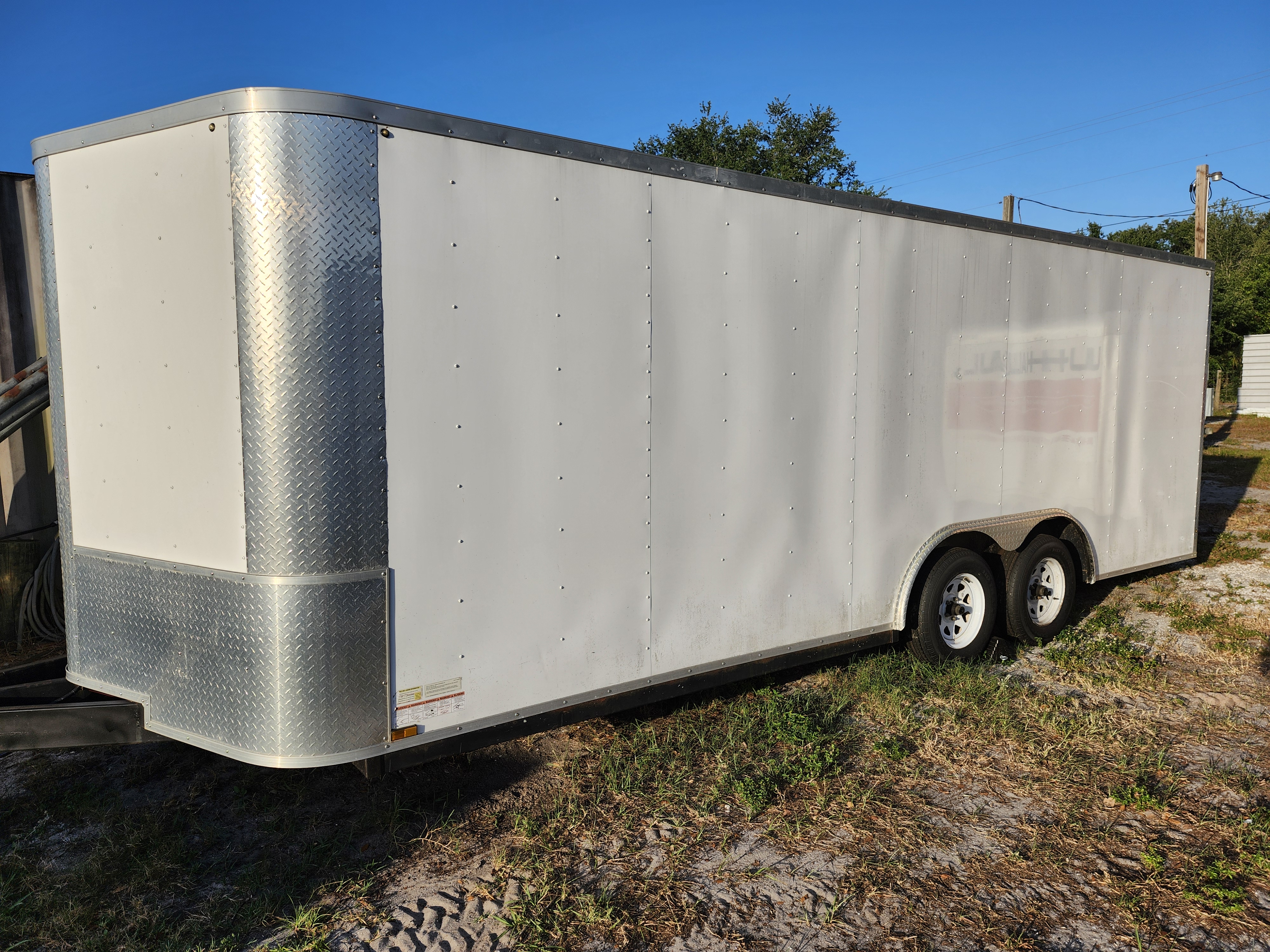 20' x 95" inside with a 77" hight. E tracked on the walls and floor and back door with 4-D rings . A 3500lb in floor winch . 12 E track strapping rings , 6-E Track straps , 4 wheel @ axel straps and moving blankets if needed