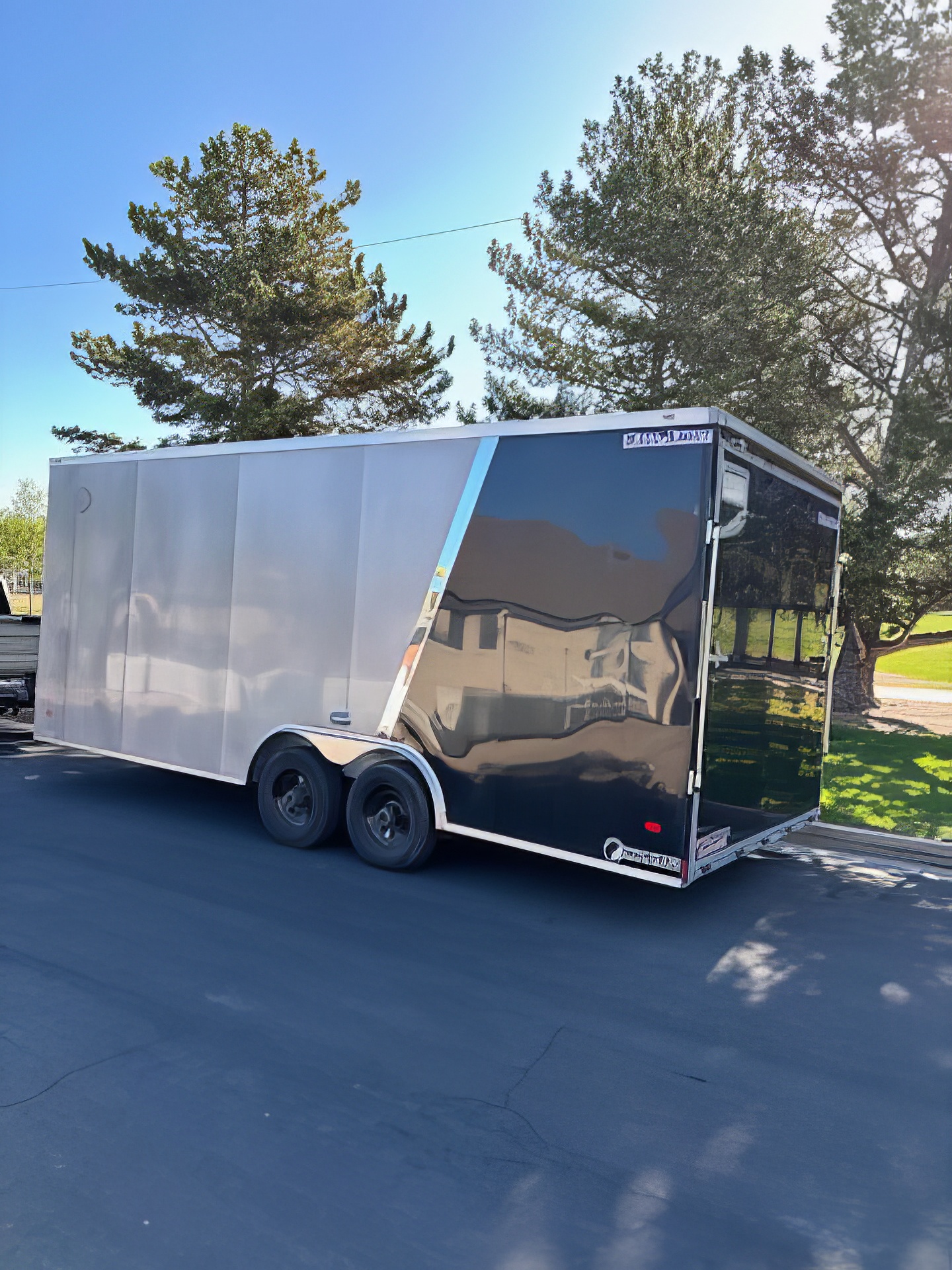 Payload Capacity: 6,440 lbs GVWR: 10,000 lbs Axle Capacity: 5,200 lbs Length: 20' 0" (240") Width: 8' 6" (102") Height: 6' 6" (78") Minimum Width: 8' 0" (96") Axles: 2 Pull Type: Bumper Nose Type: V-Front