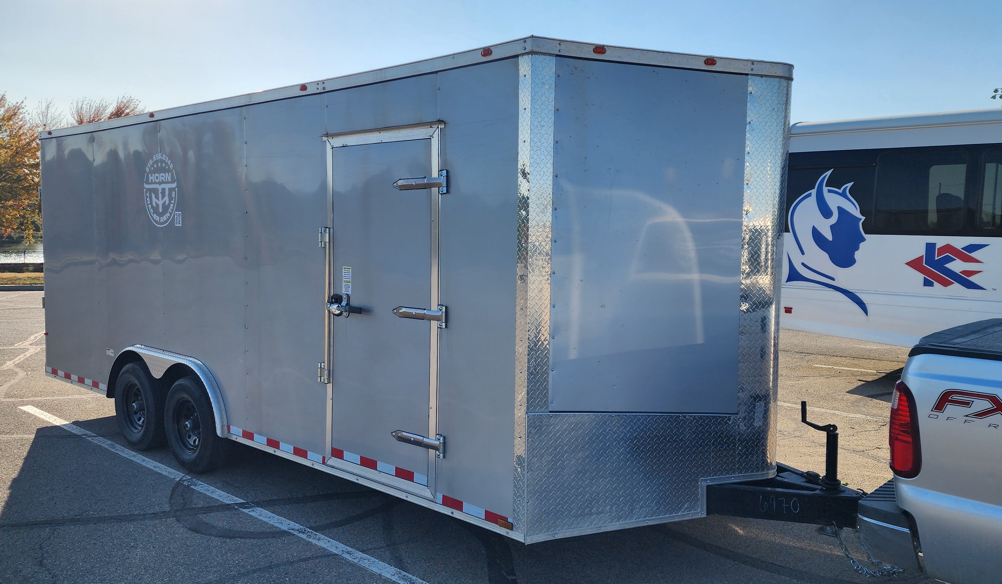 New enclosed trailer for hauling cars, motorcycles, or moving furniture/cargo. Straps for cars and cargo included in rental along with moving blankets and appliance dolly (upon request). And a spare tire for added peace of mind. Measuring 20 feet in length with an additional 2.5-foot-deep V-front. With a width of 8 feet, 81" between fenders and interior height of 82", Door opening: width 91" x height 80". This trailer maximizes its interior dimensions, offering versatility for a range of applications. Equipped with two sturdy axles, each boasting a 5,200-pound rating, ensures stability and durability on the road. The four heavy-duty tires, coupled with electric brakes, enhance safety and control during transportation. The fold-down rear door adds convenience, allowing for easy loading and unloading of your cargo. Weighing in at 3,500 pounds and featuring a Gross Vehicle Weight Rating ...