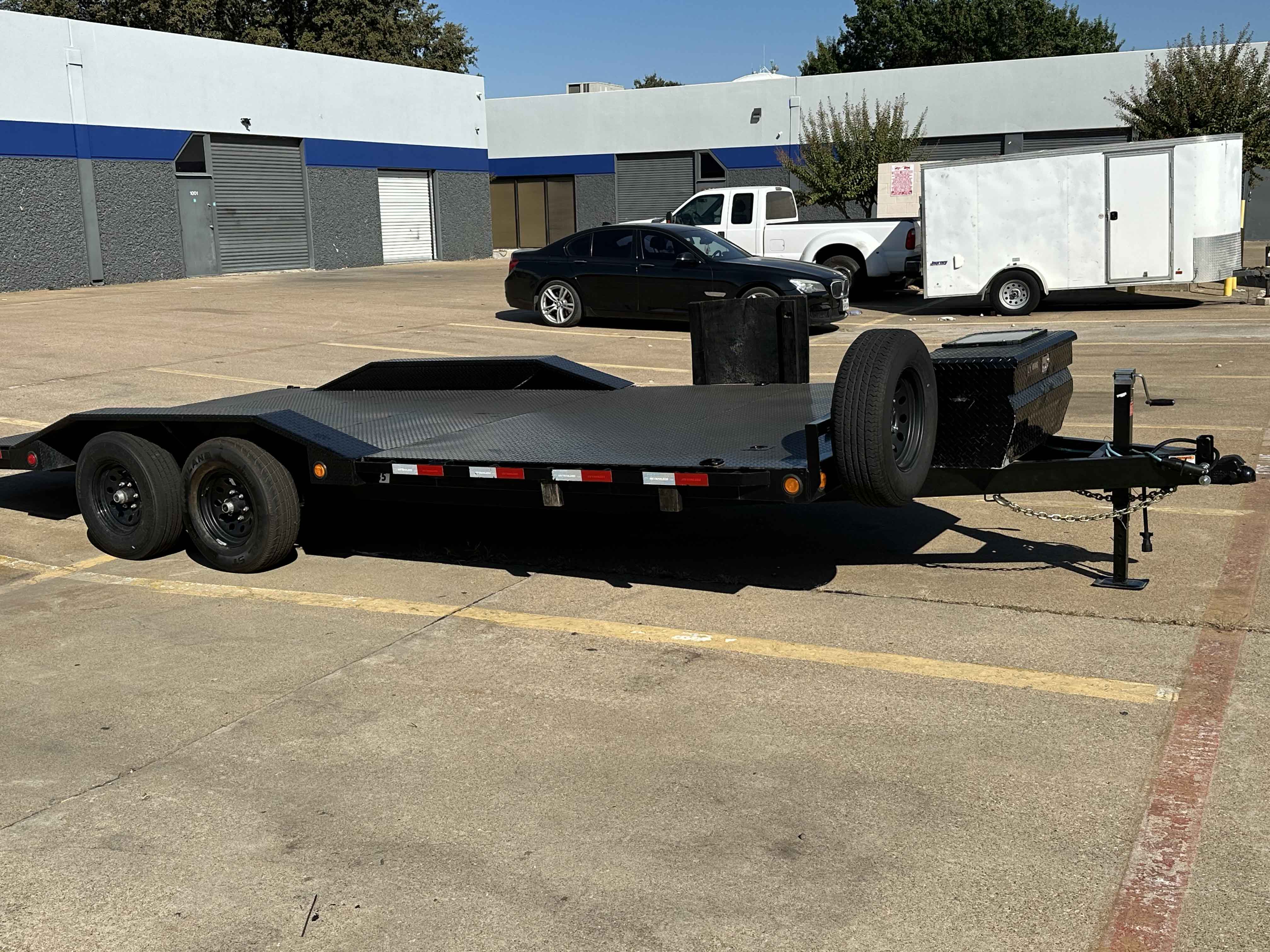 20ft 102 wide steel deck. Comes with winch, straps and ramp extension.