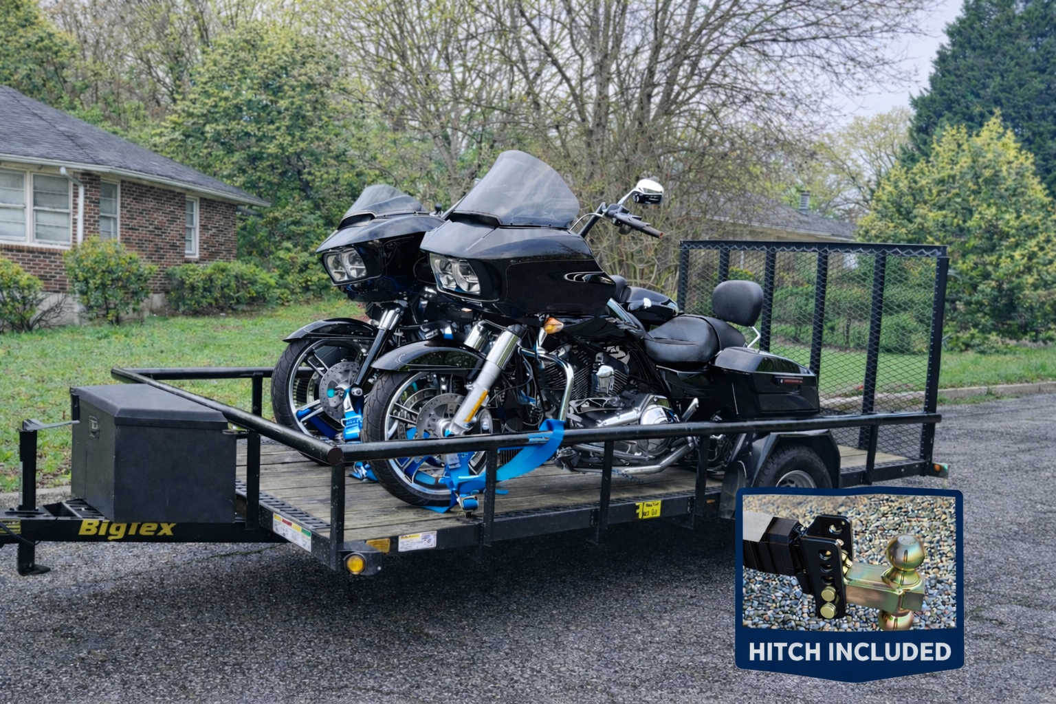 Our 6x12 utility trailer is perfect for landscaping jobs, moving equipment, motorcycles, ATVs, furniture, and more. Features: • 6’ x 12’ open deck • Fold-down rear ramp for easy loading • Etrac system for multiple tie-down points • Single axle – lightweight and easy to tow All inclusive! Adjustable tow hitch and straps INCLUDED! Perfect for: Lawn equipment Motorcycles & ATVs Small tractors Building materials Furniture & appliances